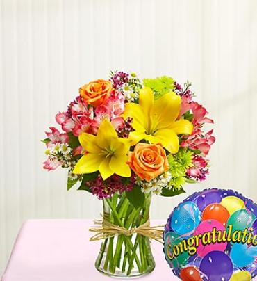 Congratulate them with elegance and style -- send our hand-gathered bouquet of roses, lilies, alstroemeria, poms and more, arranged by our florists inside a stylish clear glass vase tied with raffia as a nod to rustic European style and paired with a festive balloon. (Vase/Basket style may vary)