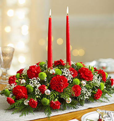 Two red candles and traditional flowers make this centerpiece a nice touch to any Christmas table for your home or a friend.